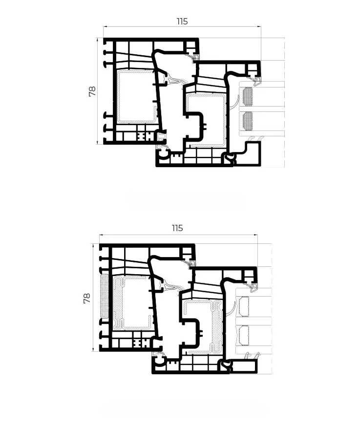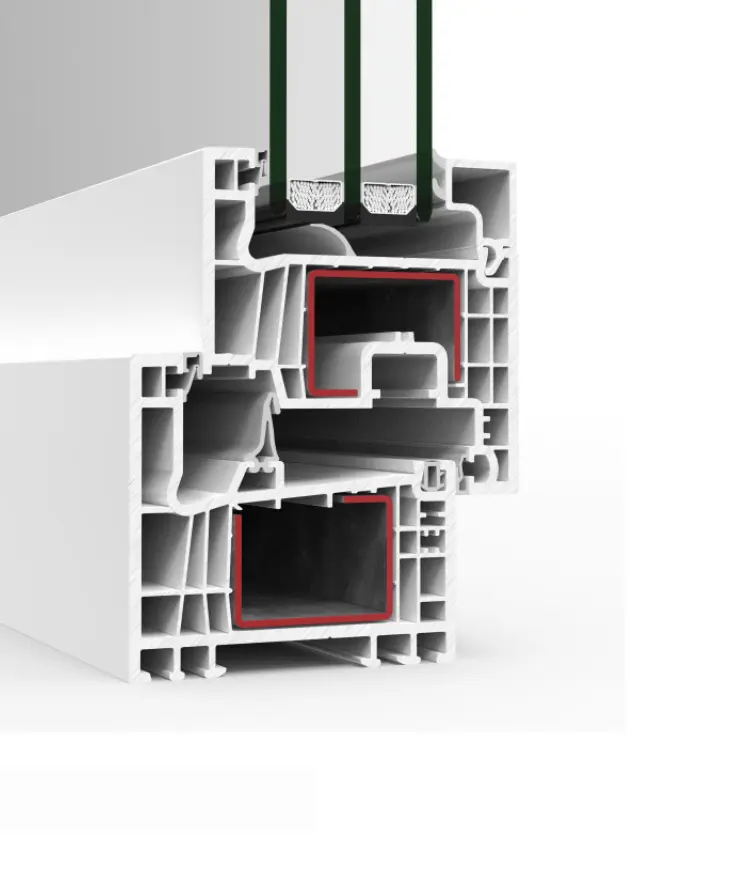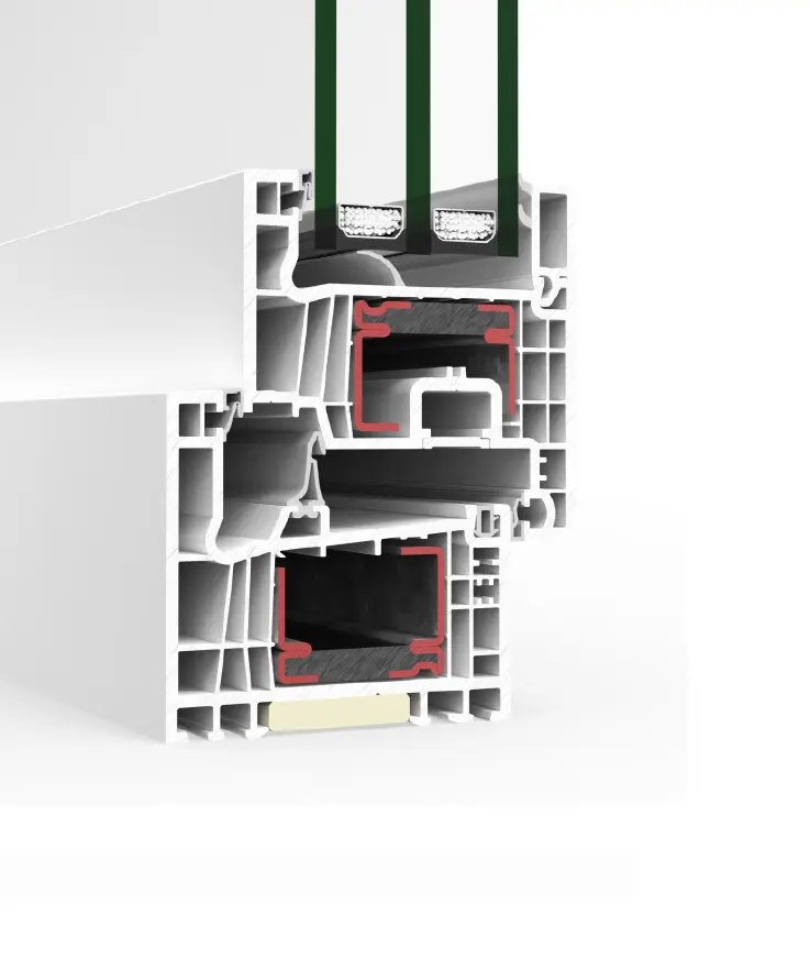 PVC window, door and balcony-door system with a straight-lined look on frame, sash and glazing beads (butt-jointed or mitered). It delivers excellent thermal and acoustic performance thanks to 78 mm-deep, six-chamber profiles and glazing capacity up to 48 mm. This series also features new gaskets that improve welding quality at profile joints. Passivhaus version available, certified for the warm-temperate category.