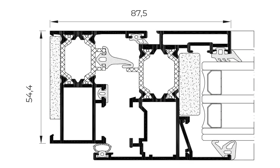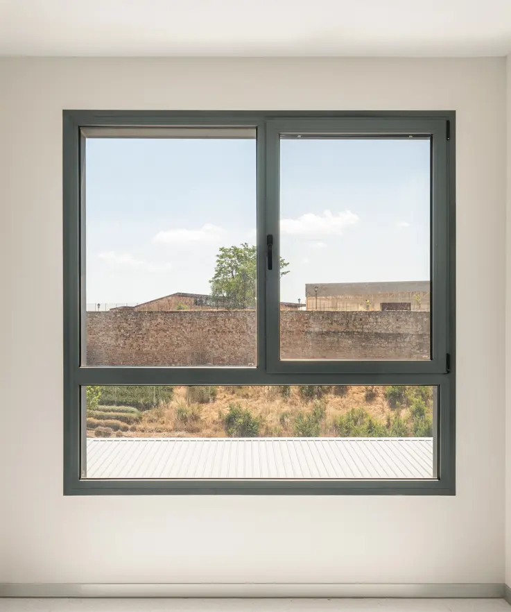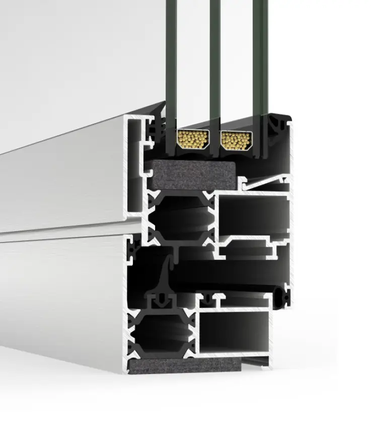 54 mm frame-depth hinged system with a 24 mm thermal break and a maximum glazing capacity of 41 mm; features that provide optimal thermal performance, Uw from 1.0 W/m²K, and acoustic performance up to 46 dB of noise protection.